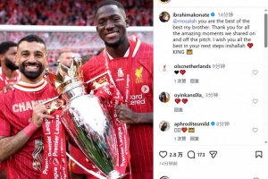 科纳特晒出与萨拉赫的捧杯合照,配文:“你是最佳中的最佳,我的兄弟。感谢你在场上场下与我共同度过的所有美妙时刻,祝你在未来的征程中一切顺利。”