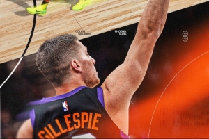 第二节比赛,吉莱斯皮再中三分,本场已命中2记三分,目前总数227记,超越昆汀·理查德森创造太阳队史单赛季三分命中数新纪录!